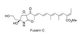 Jiří Patočka Úvod Fusariny jsou sekundární metabolity, patřící do skupiny mykotoxinů produkovaných některými druhy hub rodu Fusarium, zejména Fusarium moniliforme (dnes častěji Fusarium verticillioides) a Fusarium fujikuroi.(Farber & Scott, 1989; Rapior et al., 1993). Tyto houby se běžně vyskytují na obilninách, zejména kukuřici, ale také na rýži, pšenici a dalších zemědělských plodinách. Fusariny patří k méně známým, ale toxikologicky významným mykotoxinům, u kterých byla prokázána karcinogenní aktivita v experimentech na zvířatech (Gelderblom et al., 1986). Chemická struktura a vlastnosti Fusariny jsou polyketidové sloučeniny. Z chemického hlediska jde o poměrně reaktivní sloučeniny — přítomnost konjugovaného systému hraje roli v jeho interakci s biomolekulami (zejména s DNA) (Hider & Kong, 2010). Jedním z nejstudovanějších zástupců této skupiny je fusarin C. Vzhledem ke své lipofilní povaze se snadno kumuluje v rostlinných tkáních a může se dostat do potravního řetězce (Farber & Scott, 1989; Wiebe & Bjeldanes, 1981).