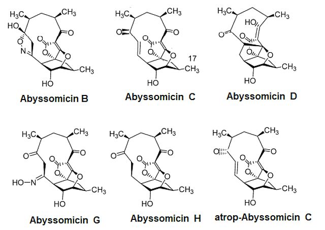 Patočka Abyssomiciny jsou skupinou polycyklických antibiotik, které představují zajímavou třídu přírodních látek s unikátní strukturou a potenciálně významnými biologickými účinky, včetně antibakteriální aktivity. Jsou to sekundární metabolity produkované některými aktinomycetami, zejména rody Streptomyces a Verrucosispora. Mají složitou polycyklickou makrocyklickou strukturu a různé typy abyssomicinů se liší v konfiguraci, stupni oxidace, nebo přítomnosti dalších funkčních skupin. Prvními popsanými sloučeninami z rodiny abyssomicinů byly abyssomicin B, C, atrop-C a D, produkované mořským aktinomycetovým kmenem Verrucosispora maris AB-18-032, který byl izolován ze sedimentu odebraného v Japonském moři (Fiedler, 2021).
