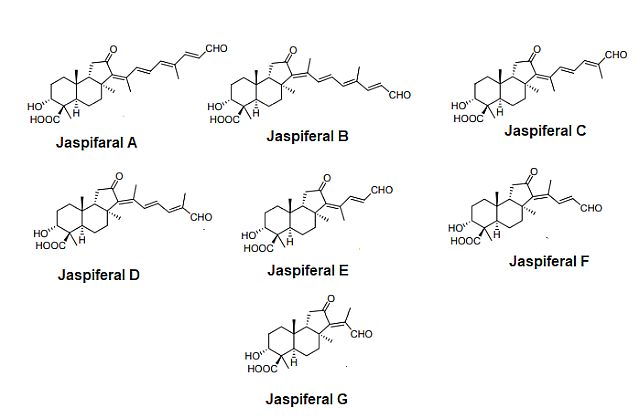 Patočka Jaspiferaly jsou cytotoxické nortriterpenoidy patřící do skupiny isomalabaricanových sloučenin. Nortriterpenoidy jsou modifikované triterpeny, které často vykazují biologickou aktivitu, včetně cytotoxicity. Jaspiferaly byly izolovány z přírodních zdrojů, nejčastěji z mořských hub (Kobayashi et al., 1996). Tento typ triterpenoidů je známý svými zajímavými farmakologickými vlastnostmi, včetně protinádorové aktivity (Tommonaro et al., 2015). Cytotoxicita jaspiferalů znamená, že mohou indukovat buněčnou smrt, což je důležité pro výzkum potenciálních protirakovinných léčiv (Bourguet-Kondracki et al., 2000). Isomalabarikanové triterpenoidy jsou skupinou chemických sloučenin odvozených od isomalabarikanu, což je tetracyklický triterpen s charakteristickou uhlíkovou kostrou. Tyto sloučeniny se vyznačují komplexní strukturou zahrnující čtyři kondenzované uhlíkové kruhy a různé funkční skupiny, které mohou být připojeny k základnímu skeletu. Jespiferaly jsou specifickým typem isomalabaricanových triterpenoidů, jejichž chemická struktura zahrnuje modifikace základního isomalabaricanového skeletu připojením dalších funkčních skupin, což přispívá k jejich biologické aktivitě. Zde jsou nejvýznamnější známé jaspiferaly:
