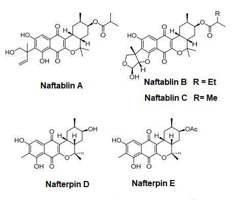 Patočka Meroterpenoidy jsou přírodní látky, které jsou částečně odvozené od terpenoidů, ale obsahují i jiné strukturní prvky. To právě vyjadřuje název „meroterpenoidy“, který pochází z řeckého slova „meros“, což znamená „část“. Jejich molekuly mají terpenoidní část, která je kombinována s jinými strukturálními fragmenty (Han et al., 2021). Takovou skupinou látek jsou naftochinonové meroterpenoidy, jejichž neterpenická část molekuly je tvořena deriváty naftochinonu (Miles et al., 2017). Bohatým zdrojem těchto přírodních látek jsou mořské aktinomycety (Shen et al., 2020), skupina vláknitých bakterií z řádu Actinomycetales, které žijí v mořském prostředí a jsou významné pro svou schopnost produkovat různé bioaktivní sloučeniny, což je dělá zajímavými z hlediska farmaceutického a biotechnologického výzkumu. Nejznámějším rodem aktinomycet je rod Streptomyces, ale v mořském prostředí jsou také další významné rody jako Micromonospora, Salinispora nebo Actinobacteria. Mořské aktinomycety jsou důležité pro vývoj nových léčiv a biotechnologických aplikací, protože produkují unikátní sloučeniny, které nelze nalézt u suchozemských mikroorganismů. Kvůli nárůstu antibiotické rezistence jsou zkoumány zejména jako potenciální zdroj nových antibiotik a terapeutik (Lam, 2006). Takovou zajímavou skupinou naftochinonových meroterpenoidů jsou naftabliny A-C, které byly identifikovány v mořském kmenu aktinomycety, Streptomyces sp. CP26-58, který byl izolován z mořského sedimentu v San Francisco Bay v Kalifornii. Tyto látky vykazovaly slabou inhibici růstu buněk HeLa (Martucci et al., 2017). Z velmi blízkého mořského kmene Streptomyces sp. CNQ-509, který byl izolován také z mořského sedimentu z oblasti La Jolla v Kalifornii, byly další dva naftochinonové meroterpenoiy, nazvané nafterpiny D a E. Nafterpiny vykazovaly aktivitu vychytávání volných radikálů (Park & Kwon, 2018).