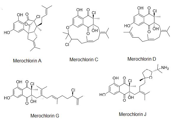 Patočka Meroterpenoidy jsou skupinou přírodních sloučenin, které jsou částečně odvozeny od terpenoidů a částečně od jiných biochemických struktur, jako jsou například fenoly, alkaloidy nebo flavonoidy. Název "meroterpenoid" pochází z řeckého slova "meros," což znamená "část," z názvu terpenoid. To vyjadřuje skutečnost, že tyto sloučeniny mají smíšený původ - obsahují jak terpenoidní část, tak i část neterpenoidní. Meroterpenoidy jsou známé pro svou širokou škálu biologických aktivit, včetně antimikrobiálních, protinádorových, protizánětlivých a antioxidačních vlastností. Jsou nalezeny v různých přírodních zdrojích, včetně rostlin, hub, mořských organismů a mikroorganismů (Goyer et al., 2023). Vzhledem k jejich komplexním chemickým strukturám a biologickým účinkům jsou meroterpenoidy předmětem intenzivního výzkumu v oblasti farmacie a biochemie. Takovou zajímavou skupinou mořských meroterpenoidů jsou merochloriny (Ryu et al., 2019). Merochloriny jsou skupina přírodních sloučenin, které byly izolovány z mořských mikroorganismů, bakterií Streptomyces sp. Tyto sloučeniny jsou zajímavé kvůli své unikátní chemické struktuře a biologické aktivitě. Jak název napovídá, merochloriny obsahují atomy chloru, které jsou vázány na aromatický kruh. Na jejich zabudování do molekul merochlorinů se podílí bakteriální haloperoxidasa (VHPO), enzym obsahující ve svém aktivním centru vanad (Kaysser et al., 2012). Tyto enzymy, známé jako vanad-haloperoxidázy, využívají vanad jako kofaktor pro katalytickou aktivitu (Diethelm et al., 2014). Jsou schopné oxidovat halogenidy za vzniku halogenovaných sloučenin, což může být součástí obrany bakterií proti predátorům nebo patogenům. Vanad-haloperoxidázy jsou tedy specifickým typem haloperoxidáz, které jsou závislé na přítomnosti vanadu (Franssen, 1994). Merochloriny dále obsahují složité polycyklické aromatické systémy a některé z nich mají p-chinonové uspořádání. V molekule se často vyskytují neobvyklé vazby mezi uhlíkovými atomy, jako například různě substituované kruhy nebo můstky. Tyto strukturální rysy nejen že činí merochloriny chemicky zajímavými, ale také jim dodávají různé biologické aktivity, jako jsou antimikrobiální, protirakovinné a další léčebné vlastnosti (López‐Pérez et al., 2017).