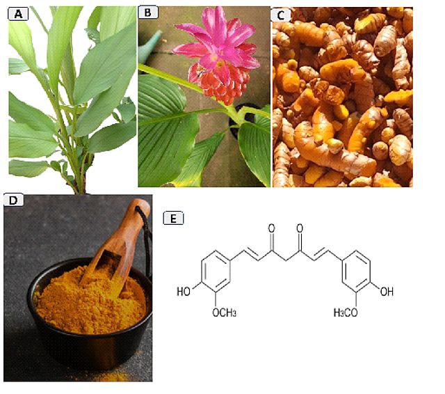 Figure 1. Curcuma longa plant. A) Plant; B) Leaf and flower; C) Rhyzomes; D) Powder; E) Curcumin (the main bioactive compound) structure.