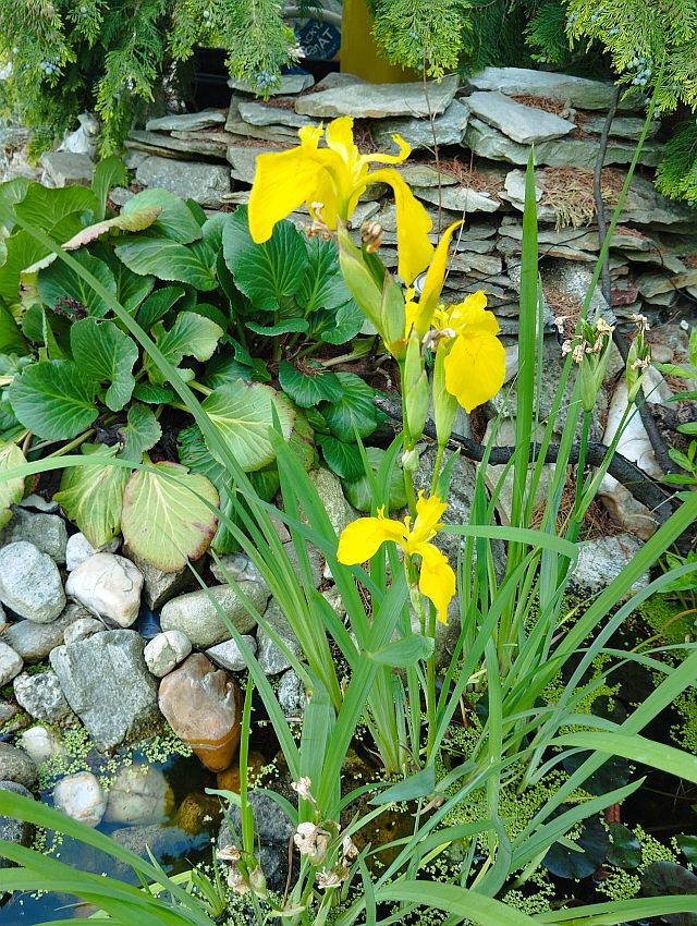 Kosatec žlutý (Iris pseudacorus) v zahradním jezírku. Foto: Jiří Patočka