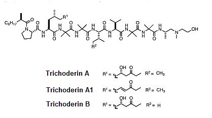 Patočka Trichoderiny jsou typem krátkých lineárních lipopeptidů produkovaných mořskými houbami rodu Trichoderma, které jsou známé pro své účinky na ochranu rostlin proti patogenům a zlepšování jejich růstu (Pruksakorn et al., 2010). Jsou součástí širší skupiny bioaktivních sloučenin produkovaných těmito houbami, které zahrnují také enzymy, sekundární metabolity a další lipopeptidy (Brotman, 2010). Trichoderiny jsou složené z lipidové a peptidové složky, což jim umožňuje pronikat do buněčných membrán a vykazovat široké spektrum biologických aktivit. Tři nové aminolipopeptidy, označené trichoderiny A, A1 a B, byly izolovány z kultury houby odvozené z mořské houby Trichoderma sp. jako antimykobakteriální látky (Pruksakorn et al., 2011). Jejich chemické struktury byly stanoveny na základě spektroskopické studie. Trichoderiny vykazovaly silnou antimykobakteriální aktivitu proti Mycobacterium smegmatis, Mycobacterium bovis BCG a Mycobacterium tuberculosis H37Rv za standardních aerobních růstových podmínek, jakož i za hypoxických podmínek navozujících dormanci, s hodnotami MIC v rozmezí 0,02–2,0 μg/ml (Kavianinia et al., 2016).