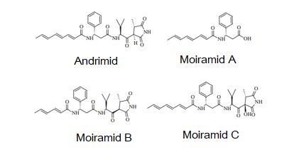 Patočka, Matěj Malík, Patrik Olekšák Pseudomonas je rod gramnegativních proteobakterií, které byly izolovány z půdy a sladké i slané vody. Tento rod se skládá z druhů, které jsou geneticky různorodé (Holloway, 1969; Holloway & Morgan, 1986; Poblete‐Castro et al., 2020). Zatímco suchozemské pseudomonády jsou relativně dobře prozkoumány (Spiers et al., 2000), bylo popsáno pouze několik mořských izolátů tohoto rodu, které produkují nové bioaktivní látky. Chemické struktury bioaktivních látek z mořských Pseudomonas jsou také velice různorodé (Isnansetyo & Kamei, 2009) a představují bohatý zdroj nových molekul, které mohou nalézt široké využití. Mořské Pseudomonas spp. jsou postupně izolovány z celé řady mořských prostředí a v nich nalezené sekundární metabolity jsou potenciálním, dosud nevyužitým zdrojem lékařsky významných bioaktivních látek. Podívejme se nyní na skupinu takových sekundárních metabolitů zvaných moiramidy, které byly nalezeny v Peudomonas fluorescens. Tato bakterie je velmi variabilní a lze ji nejít, nejen v moří, ale také na pevnině (Rhodes, 1959). Moiramidy, které byly nalezeny v mořských izolátech P. fluorecens získaných z mořských ploštěnců jsou deriváty pyrrolidindionu (Isnansetyo & Kamei, 2009). Moiramid B má širokospektrální antibakteriální aktivitu a působí tak, že inhibuje bakteriální acetyl-CoA karboxylázu (Silvers et al., 2014). Moiramid B je první silnou antibakteriální sloučeninou z mořských bakterií s tímto mechanismem účinku.