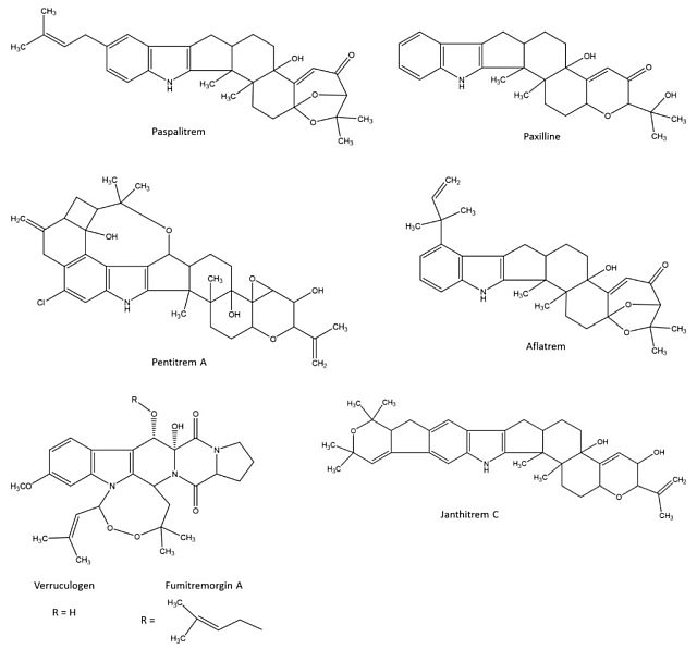 Patočka, Matěj Malík Tremorgenní mykotoxiny jsou toxické sekundární metabolity produkované určitými houbami či plísněmi, které mohou vyvolat třes nebo mimovolní pohyby svalů u zvířat a lidí po expozici (Crews et al., 1985). Mykotoxiny mohou kontaminovat potraviny a krmiva, což představuje riziko pro zdraví lidí a zvířat (Evans & Gupta, 2018). Tremorgenní toxiny produkují zejména houby, jako jsou druhy rodů Penicillium a Aspergillus (de Jesus et al., 1983; Land et al., 1987). Příkladem mohou být penitremy a verrucologeny, což jsou silné tremorgenní mykotoxiny ovlivňující centrální nervový systém (Peterson et al., 1982). Podobný účinek mají i fumonisiny, produkované houbami rodu Fusarium, které kontaminují zejména kukuřici a její produkty (Campbell, 2016). Stachybotrys chartarum, běžně známá jako černá plíseň, produkuje stachybotryotoxiny, které mohou vyvolat řadu neurologických příznaků, včetně třesu (Kuhn et al., 2003). Mezi tremorgenní toxiny můžeme zařadit také námelové alkaloidy a další toxiny produkované houbami rodu Claviceps (Uhlig et al., 2009), které infikují zejména obiloviny (Agriopoulou, 2021). U člověka mohou způsobit řadu příznaků, včetně třesu, halucinací a křečí, souhrnně známých jako ergotismus (Steyn, 1995). Zde jsou uvedeny strukturní chemické vzorce některých dalších tremorgenních mykotoxinů, které mohou vyvolat intoxikace u člověka i zvířat.