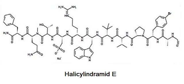 Patočka Halicylindramidy jsou skupinou antifungálních depsipeptidů. První sloučeniny tohoto typu, označené jako halicylindramidy A až E, byly izolovány z mořských hub rodu Halichondria (H. cylindrata) (Li et al., 1995) a další halicyndramidy, označené F, G a H, byly nalezeny v mořských houbách rodu Petrosia (Hahn et al., 2016). Halicylindramid A byl připraven také synteticky (Seo et al., 2009). Tato značně heterogenní skupina depsipeptidů (lineární i cyklické) vykazuje řadu farmakologických účinků (Li et al., 1995, 1996; Joseph et al., 2012; Vitali, 2018) a mohla by nalézt uplatnění v prevenci a terapii nepřenosncu chorob, jako jsou kardiovaskulární onemocnění, rakovina, respirační onemocnění a cukrovka (Pangestuti & Kim, 2017). Tyto nemoci jsou celosvětově hlavní příčinou úmrtí a invalidity.