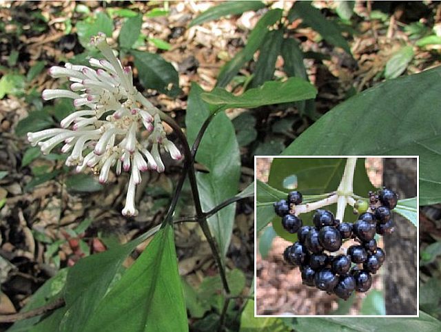 Kvetoucí Chassalia curviflora a její plody.