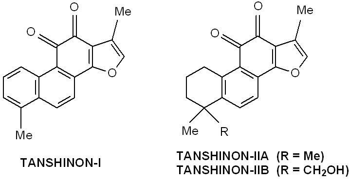 Navrátilová Tanshinony jsou lipofilní diterpenické sloučeniny abietanového typu, které byly poprvé izolovány z kořenů šalvěje červenokořenné (Salvia miltiorrhiza Bunge). První z této početné skupiny látek byly izolovány již v roce 1930 a od té doby probíhá intenzivní výzkum. Od té doby bylo popsáno již více než 40 různých látek. K nejvýznamnějším patří tanshinony I, IIA a IIB, isotanshinon, nortanshinon, cryptotanshinon, isocryptotanshinon I a II, hydroxytanshinon, tanshinol A, B a C, miltion a miltiron. Později byly tanshinony zjištěny i v dalších druzích rodu Salvia (Zhou et al., 2005; Zhang et al., 2012).